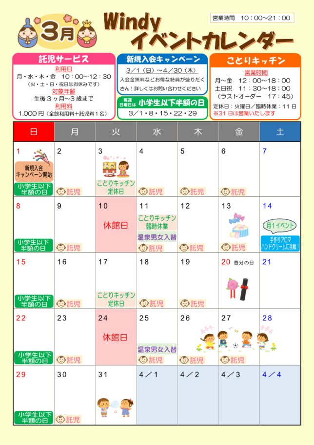 春の新規入会キャンペーン外壁塗装工事のご案内3月 Windy イベントカレンダー新着情報3月 Windy イベントカレンダー2026年3月1日外壁塗装工事のご案内2026年2月25日春の新規入会キャンペーン2026年2月16日最新動画トピックスご利用案内 【 詳細地図 】JRでJR笹津駅より徒歩8分バスで大沢野福祉センター前すぐお車でJR富山駅より約30分富山ICより約20分富山空港より約15分営業時間10:00~21:00(最終受付時間は20:00)7月18日(土)~8月23日(日)の土曜日・日曜日・祝日およびお盆期間(13日~16日)は、9時30分から営業します。休館日毎月第2・4火曜日(但し、祝日相当日は翌日)6月 第4月~水曜日12月 第2月~水曜日1月1日7月第4火曜日、8月第2・4火曜日は営業致します 個人情報保護に対する基本方針について【 ご利用案内 】