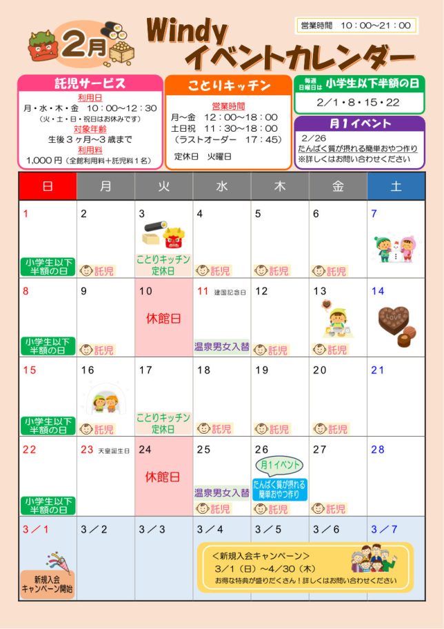 2月 Windy イベントカレンダー新着情報2月 Windy イベントカレンダー2026年2月2日「とやまし市民生きがいづくり講座&多世代交流イベント」のご案内2026年1月14日スタンプカード2025年3月20日最新動画トピックスご利用案内 【 詳細地図 】JRでJR笹津駅より徒歩8分バスで大沢野福祉センター前すぐお車でJR富山駅より約30分富山ICより約20分富山空港より約15分営業時間10:00~21:00(最終受付時間は20:00)7月18日(土)~8月23日(日)の土曜日・日曜日・祝日およびお盆期間(13日~16日)は、9時30分から営業します。休館日毎月第2・4火曜日(但し、祝日相当日は翌日)6月 第4月~水曜日12月 第2月~水曜日1月1日7月第4火曜日、8月第2・4火曜日は営業致します 個人情報保護に対する基本方針について【 ご利用案内 】